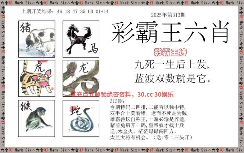 313期:正版彩霸王:九死一生后上发,蓝波双数就是它。 看生肖:今期送蓝波开的生肖 七肖:鼠猪虎兔鸡龙蛇 |